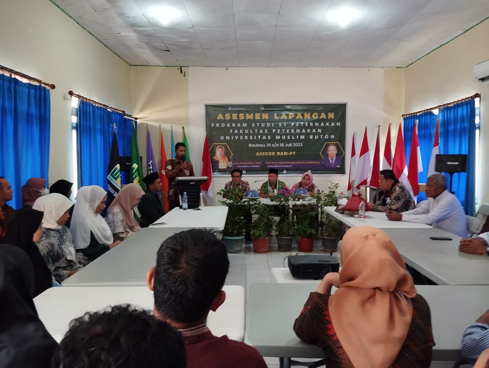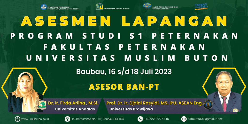 Kegiatan Asesmen Lapangan Akreditasi Prodi S1 peternakan ini dilakukan oleh 2 Asesor dari BAN-PT, yakni Dr. Ir. Firda Arlina, M.Si dari Universitas Andalas, dan Prof. Dr. Ir. Djalal Rosyidi,MS.IPU.Asan.Eng dari Universitas Brawijaya. Segenap civitas akademika Fakultas Peternakan, khususnya tim akreditasi Prodi Peternakan telah menyiapkan data-data yang dibutuhkan sekaligus menghadirkan beberapa stakeholder terkait, baik dari pihak Universitas Muslim Buton, mahasiswa, dosen serta mitra kerja sama. Asesmen lapangan ini bertujuan untuk mengkonfirmasi data dan informasi yang diajukan program studi sebagai dasar dalam penilaian akreditasi program studi serta untuk menjamin proses akreditasi program studi.